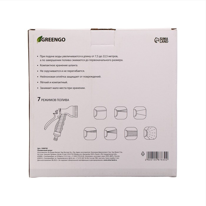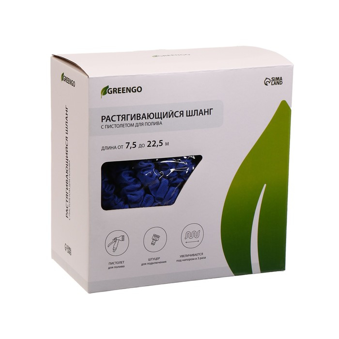 Шланг поливочный растягивающийся от 7,5 до 22,5 м, латекс, быстросъёмный, с поливочным пистолетом и штуцером, Greengo