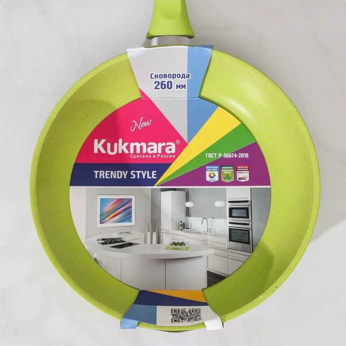Посуда линии Trendy style разработана в соответствии с последними модными тенденциям. Сковорода Kukmara сделана из литого алюминия, с внутренней и внешней стороны — антипригарное покрытие увеличенной прочности, изготовлено на водной основе по немецким технологиям.