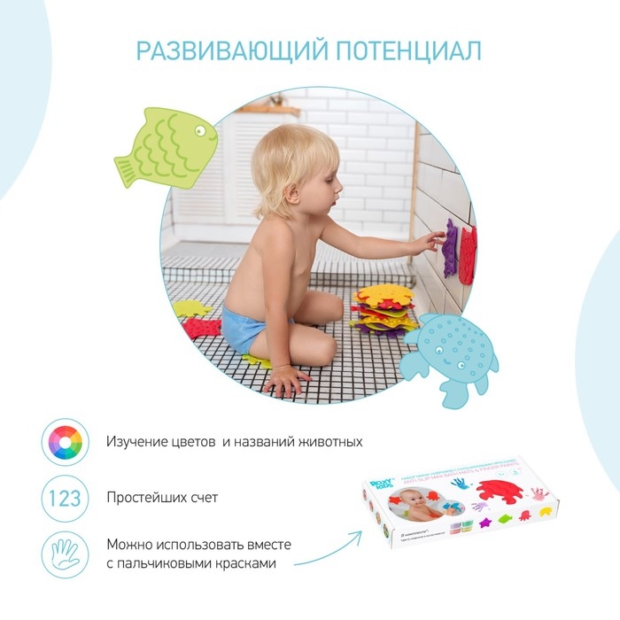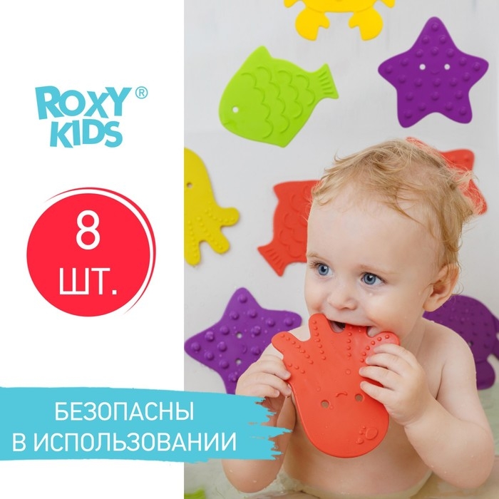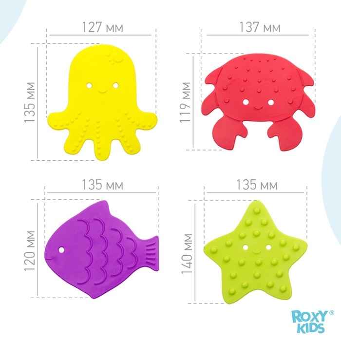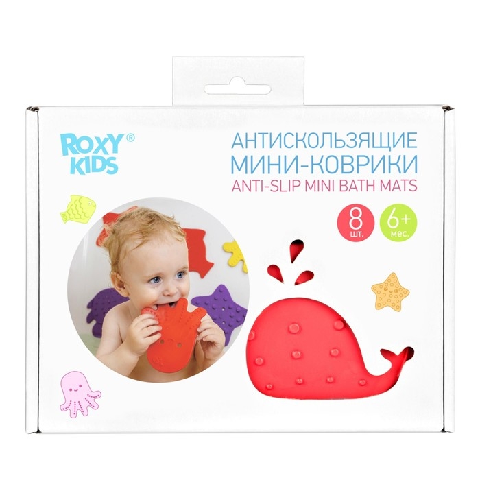 Мини коврики для ванной от ROXY-KIDS произведены в России из современного и безопасного материала ТЭП. Этим коврикам можно найти множество применений. Мини-коврики станут отличной заменой большому коврику, который неудобно промывать и сушить. Также их используют как массажеры, потому что рельефная поверхность обеспечивает бережный массаж стоп и ладоней. Ребенок может грызть их, потому что они изготовлены из специального безопасного материала. Ими можно также украсить интерьер, налепив коврики на дно и стенки ванны или кафель, чтобы не только обеспечить удобство, но и расставить яркие цветовые акценты. Кроме того, эти мини-коврики абсолютно не пахнут, потому что не содержат ПВХ. Для ухода их достаточно просто периодически промывать с мылом, полоскать и хорошо сушить. Они легко и надежно крепятся с помощью присосок на любую гладкую поверхность, при этом не оставляют следов. В ассортименте есть несколько наборов ковриков.