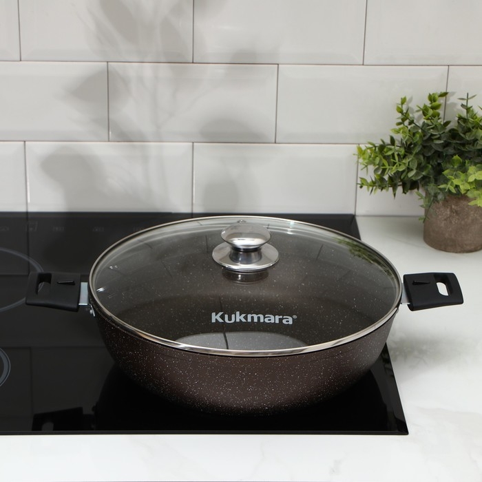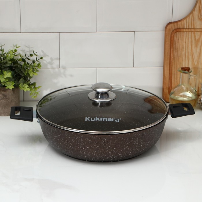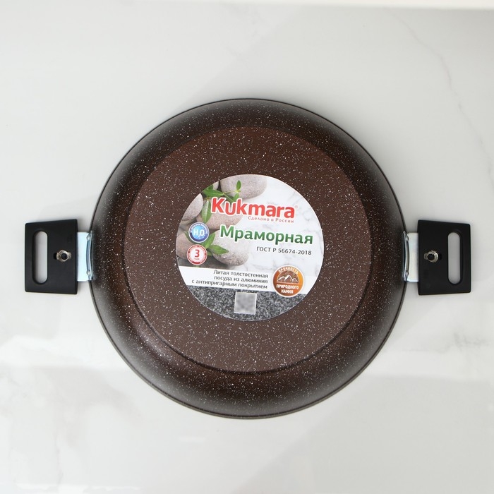Посуда Kukmara «Мраморная» изготовлена из литого алюминия и покрыта инновационным антипригарным мраморным покрытием на водной основе, усиленным сверхтвёрдыми частицами минералов.