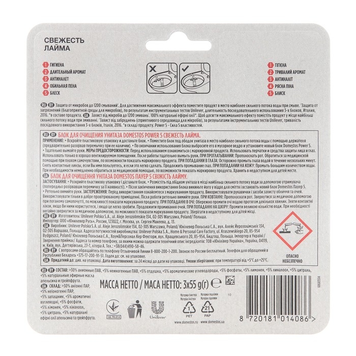 С блоками Domestos Power 5 поддержание чистоты и свежести вашего туалета стало проще. Domestos Power 5 – на защите чистоты, гигиены, а значит и здоровья вашей семьи.