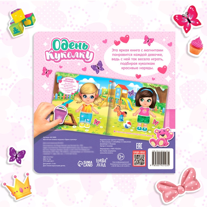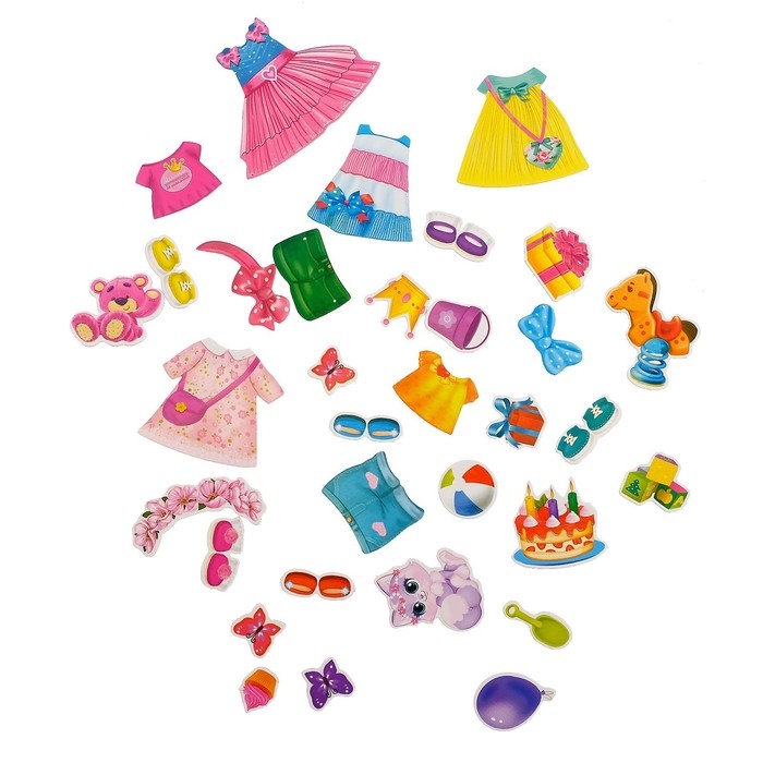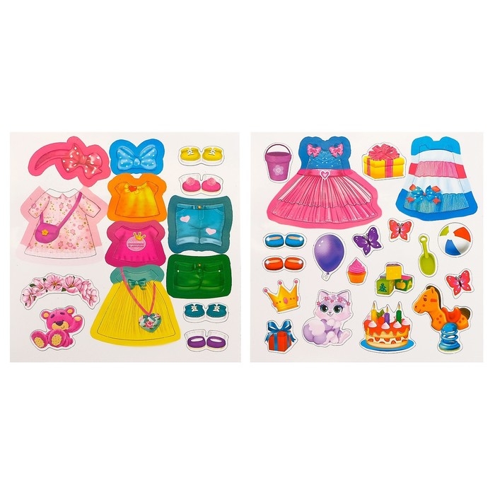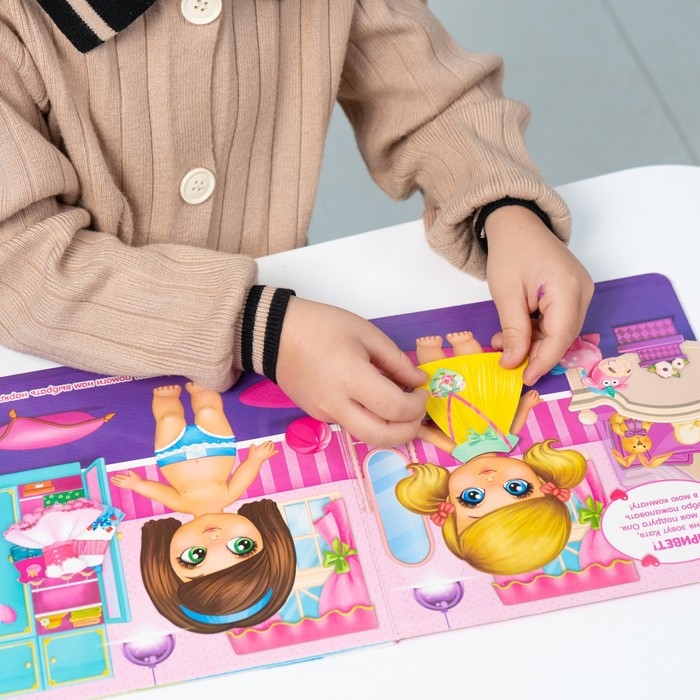 В книге ребёнок найдёт задания, которые нужно выполнять, используя магнитные фигурки с одеждой. Малышка будет крепить их на куколок, подберёт им модный образ.