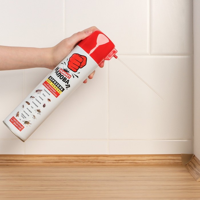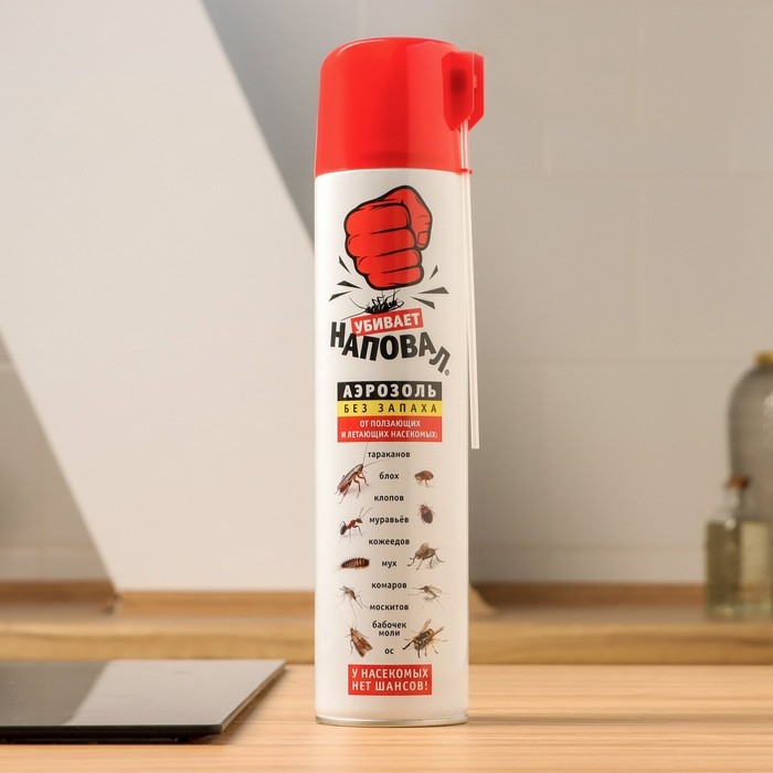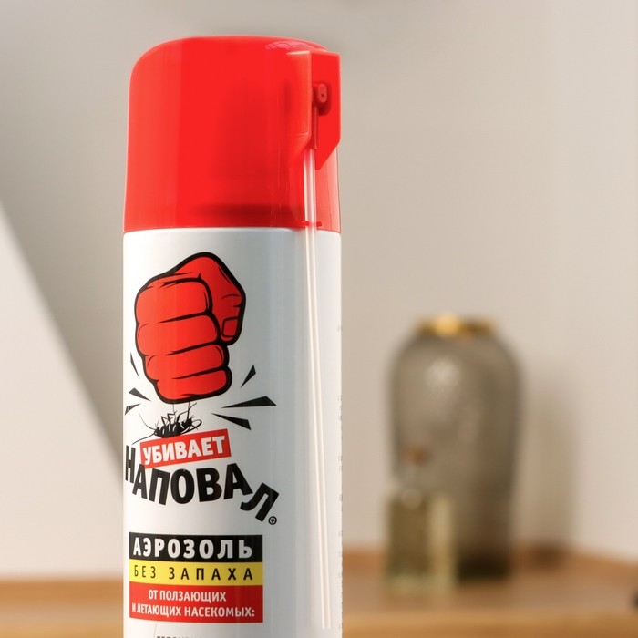 Средство инсектицидное Дихлофос №1 без запаха НАПОВАЛ - это инсектицидное средство для уничтожения в помещениях летающих и ползающих насекомых: тараканов, блох, клопов, муравьев, кожеедов, мух, комаров, москитов, бабочек моли, ос. Способ применения: Перед применением баллон хорошо встряхнуть. Для уничтожения ползающих насекомых с расстояния 15-20 см направить струю аэрозоля на поверхности- места скопления, возможного обитания или пути продвижения насекомых: тараканов- щели вдоль плинтусов и прилегающие к ним участки вдоль стен и пола, вдоль труб водопроводной и канализационной систем; клопов- места отставания обоев, обратную сторону картин, ковров; блох- стены на высоту до 1м, а так-же коврики и подстилки для животных с обратной стороны (после обработки постирать их в моющем растворе!); муравьев- пути передвижения и места скопления; кожеедов- плинтусы под радиаторами отопления, кроватями, шкафами, подоконники, обратную сторону шкафов и полок. Для уничтожения летающих насекомых: направить струю аэрозоля в воздух на места скопления насекомых и на места посадки мух в течение 3-5 сек. для помещений площадью 14-18 кв.м. и 10-12 сек. для помещений 25-30кв.м. Для уничтожения ос на чердаках, террасах и сараях обработать гнезда снаружи в ранние часы на рассвете, когда когда активность насекомых минимальна.Обработку проводить при закрытых окнах и дверях, через 15 минут помещение проветрить в течение 30 минут сквозным потоком воздуха и провести влажную уборку поверхностей, с которыми могут соприкасаться люди.Составциперметрин 0,2%, тетраметрин 0,15%, синергист, отдушка, углеводородный пропеллент, растворитель