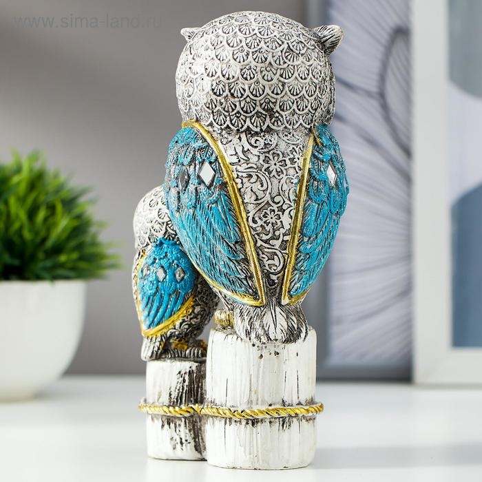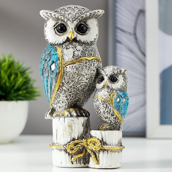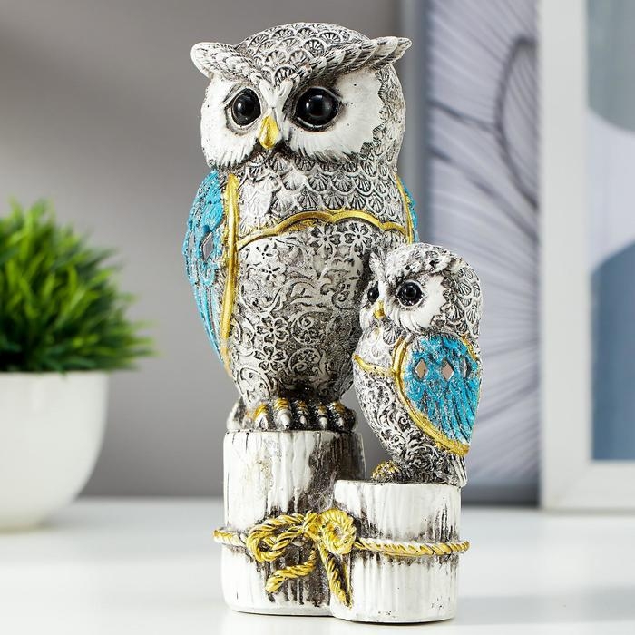 Сувенир полистоун "Серый филин с синими крыльями, с совёнком на пеньках" 16,8х9,5х5 см