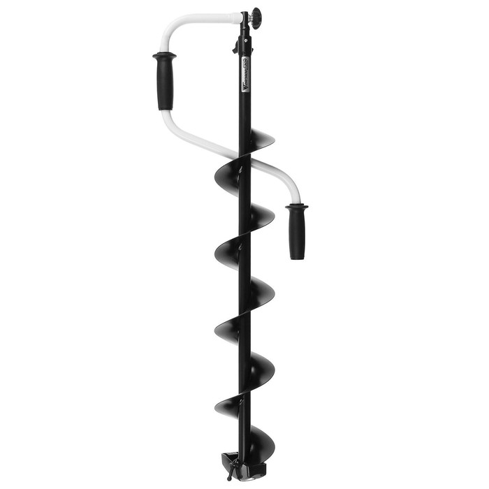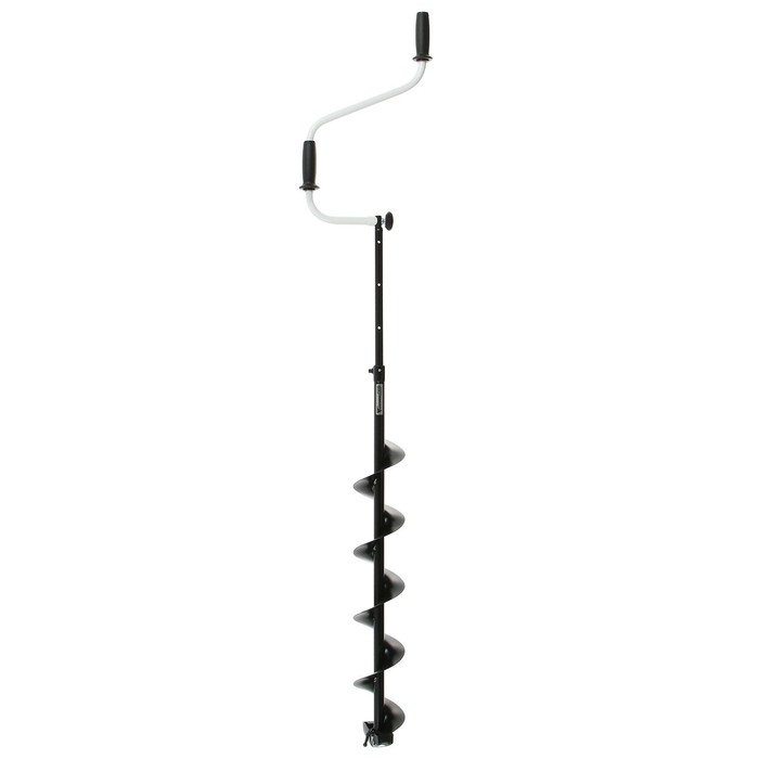 Верхняя рукоятка ледобура смещена относительно оси ледобура на 101 мм, а нижняя на 169 мм. Такое расположение рукояток позволяет вращать ледобур одновременно двумя руками, тем самым увеличивая скорость бурения лунок во льду. Телескопическая вставка-удлинитель позволяет комфортно бурить лёд, подстраивая ледобур под рост рыболова. Возможно ступенчато увеличивать глубину бурения до полутора метров. Для использования при бурении шуруповёрта необходимо доукомплектовать шнек адаптером АШ-02. Для более глубокого льда шнек можно нарастить удлинителем адаптера под шуруповерт УА-800.