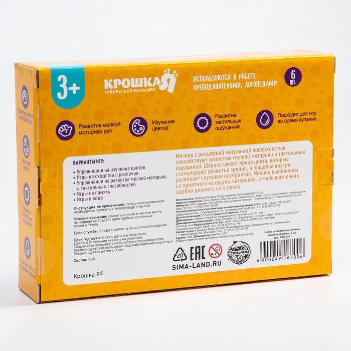 Набор развивающих тактильных мячиков «Цвета и формы», с пищалкой, 6 шт, Крошка Я