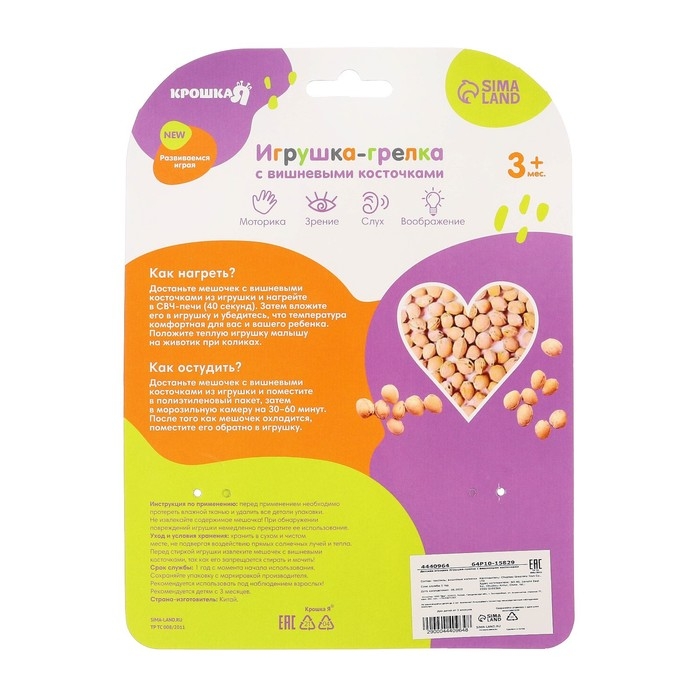 Согревает. Как нагреть? Достаньте подушечку с вишневыми косточками из игрушки и нагрейте в СВЧ печи 40 секунд. Затем вложите подушечку в игрушку и убедитесь, что температура комфортная для вас и вашего ребёнка. Положите теплую игрушку малышу на животик при коликах.