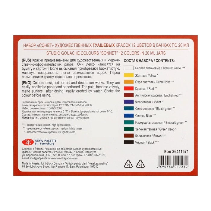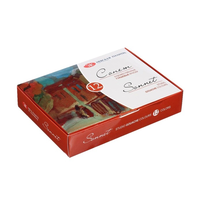 Палитра гуашевых красок в наборе "Сонет" состоит из 12 основных цветов, необходимых начинающему художнику для работы.