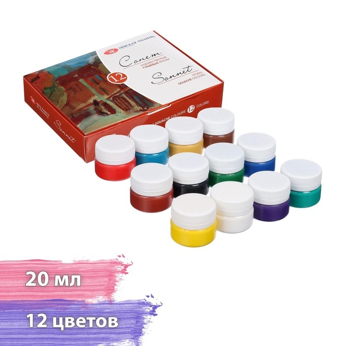 Гуашь художественная, набор 12 цветов х 20 мл, ЗХК "Сонет", (36411571)