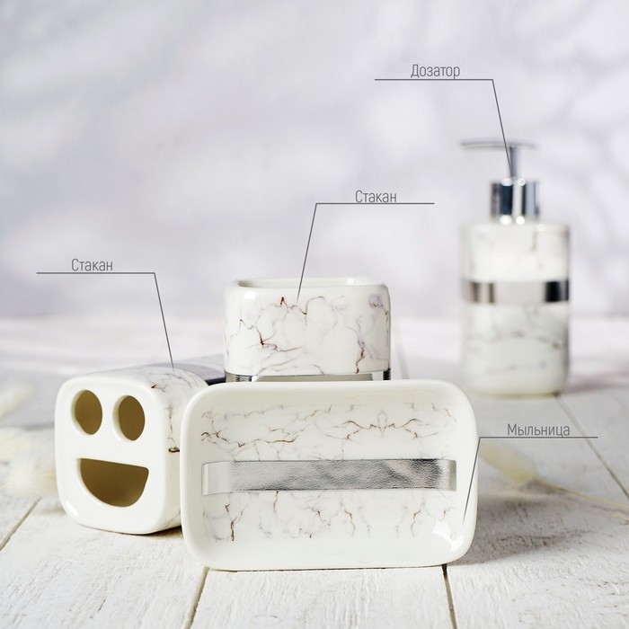 Набор аксессуаров для ванной комнаты Доляна «Изящный барельеф», 4 предмета (дозатор 250 мл, мыльница, 2 стакана), цвет белый