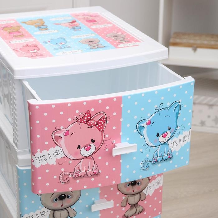 С помощью практичного пластикового комода вы правильно организуете хранение вещей. Изделие имеет жёсткую конструкцию за счёт цельных боковых стенок. Отсутствие острых углов делает его безопасным для ребёнка. Комод изготовлен из экологически чистого материала, не содержит вредных веществ.