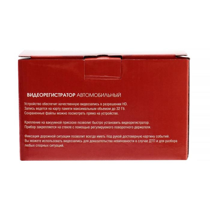 Устройство обеспечит качественную видеозапись в разрешении HD. Запись ведется на карту памяти максимальным объемом до 32 Гб. Сохраненные файлы можно посмотреть прямо на устройстве. Крепление на вакуумной присоске позволит быстро установить видеорегистратор. Прибор закрепляется на стекле с помощью регулируемого поворотного держателя. Фиксация дорожной ситуации позволит всегда иметь под рукой достоверную картину событий. Вы можете использовать видеозапись для доказательства невиновности в случае ДТП и для разбора любых спорных ситуаций.