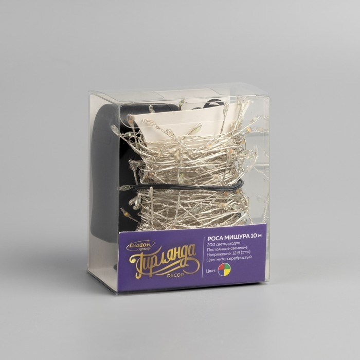 Гирлянда «Мишура» 10 м роса, IP20, серебристая нить, 200 LED, свечение мульти, 12 В