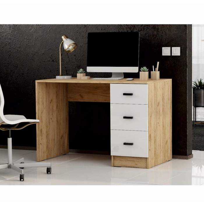 Стол письменный СТАНДАРТ - представленный перед вами, воплощает в себе безупречный стиль, современность, функциональность и надежность. Модель стола, выполнена в сочетании, прекрасных цветов: Белый/Дуб вотан, придавая изделию элегантный вид и природный шарм, что добавляет к его индивидуальности. Он оснащен, тремя выдвижными ящиками, благодаря которым, можно организовать пространство для организации ваших вещей и поддержания порядка, на ваше.