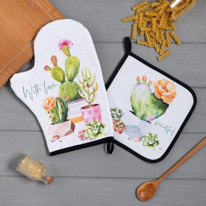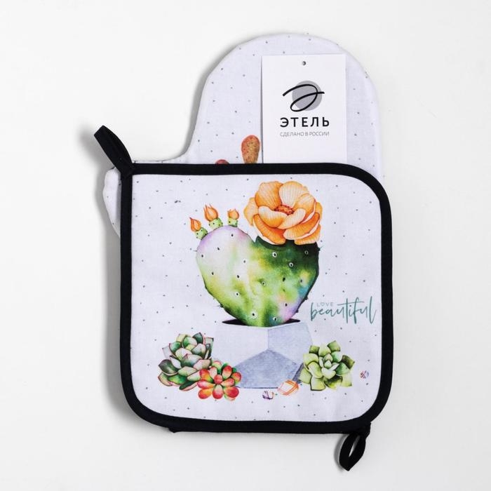 Кухонный набор Этель "Love beautiful": варежка-прихватка 20х28 см, прихватка 19х19 см, 100% хлопок