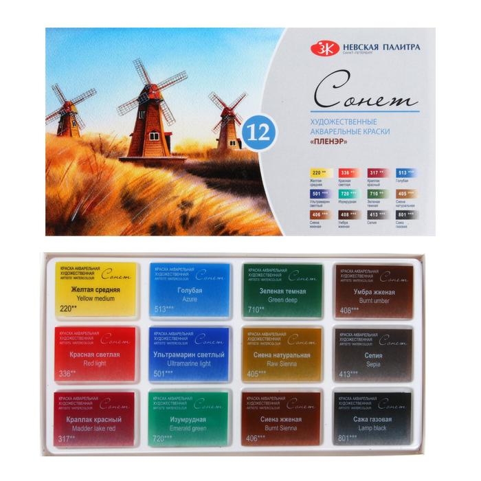 Акварель художественная в кюветах, 12 цветов х 2.5 мл, ЗХК "Сонет", "Пленэр", 35411879