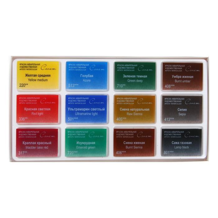 Художественные акварельные краски "Сонет" разработаны для начинающих художников, открывающих или совершенствующих свои творческие способности. Изготавливаются по современным рецептурам на основе преимущественно органических пигментов и синтетического связующего. Обладают интенсивностью цвета и прозрачностью. Превосходно смешиваются, размываются и легко берутся на кисть. Палитра набора акварели "Сонет" Пленэр состоит из специально подобранных 12 цветов акварели для написания пленэрных работ начинающими художниками.