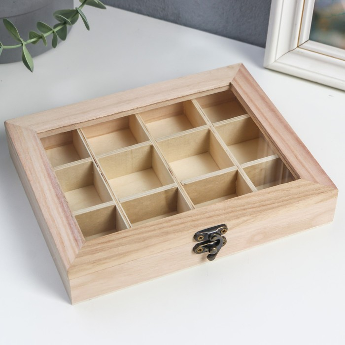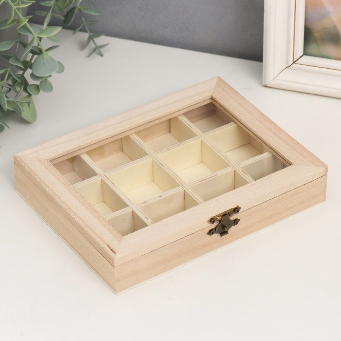 Шкатулка дер. под роспись "Прямоугольная со стеклянной вставкой" 12 отделений 3,5х19х15 см