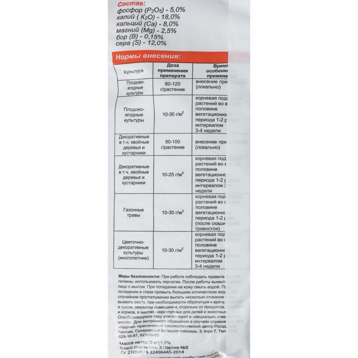 Комплексное минеральное удобрение. Назначение: фосфорно-калийное удобрение предназначено для внесения под огородные, садовые и декоративные культуры. Эффективно использовать осенью при перекопке почвы, при закладке посадочных ям, для подкормок в период плодоношения и в конце вегетации. Доза применения препарата: 35-60 г на 1 м2 - при осенней обработке почвы, 35-60 г на 1 м2 - совместно с азотными удобрениями - при весенней обработке почвы. Время, особенности применения: 1 столовая ложка вмещает 20 г удобрения. Состав: P2O5 (%): 5; K2O (%): 18; CaO (%): 8; MgO (%): 2.5; S (%): 12. Микроэлементы: В - 0.15.