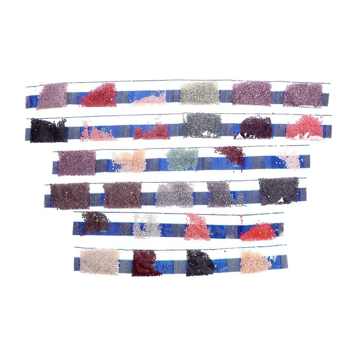 Разложите кристаллики с помощью карандаша по указанной схеме, заполнив полотно. Тканевая основа с точечным клеевым покрытием будет надёжно удерживать стразы. На картине уже обозначены необходимые оттенки, а цветовая таблица расположена рядом с рабочей областью холста.