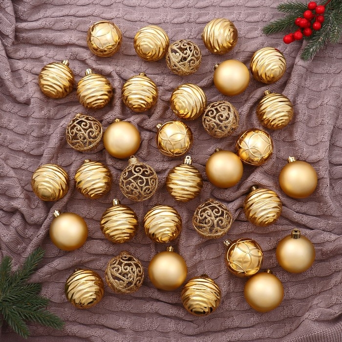 Набор шаров пластик d-6 см, 34 шт "Николь узоры" золото