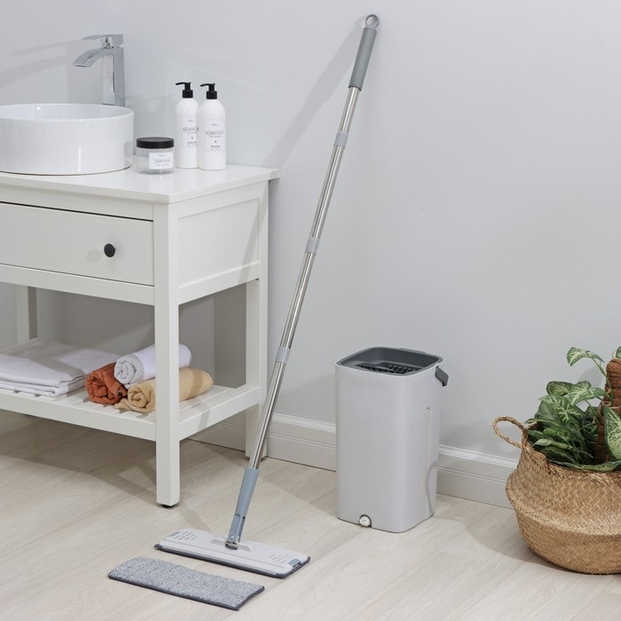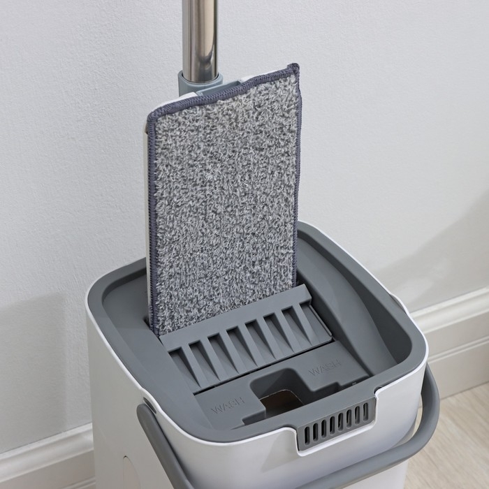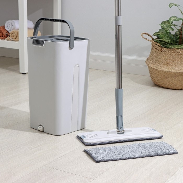 Этот набор включает ведро с двумя отсеками, плоскую швабру и две насадки из микрофибры. Ведро оснащено специальным отсеком для полоскания и отжима, что позволяет эффективно удалять загрязнения с насадок, а также сливным отверстием для быстрого удаления использованной воды.
