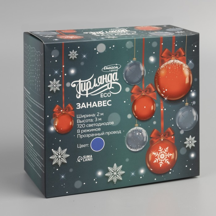 Гирлянда «Занавес» 2 × 3 м, IP20, прозрачная нить, 720 LED, свечение синее, 8 режимов, 220 В