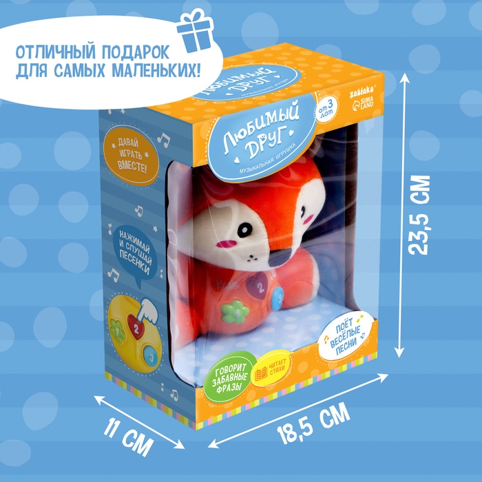 Музыкальная игрушка «Любимый друг» непременно порадует ребёнка. Забавный зверёк умеет петь и разговаривать. Нажимайте на яркие кнопочки и слушайте весёлые песенки, стишки и фразы.