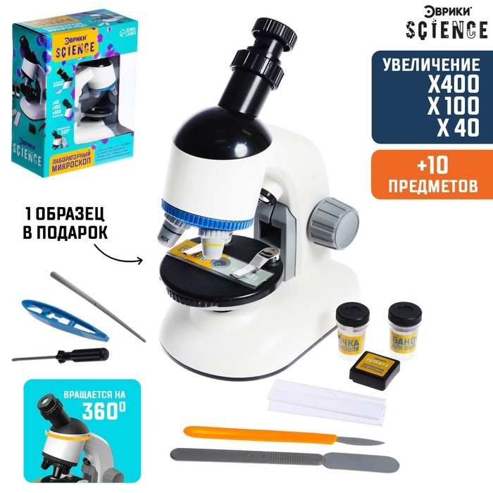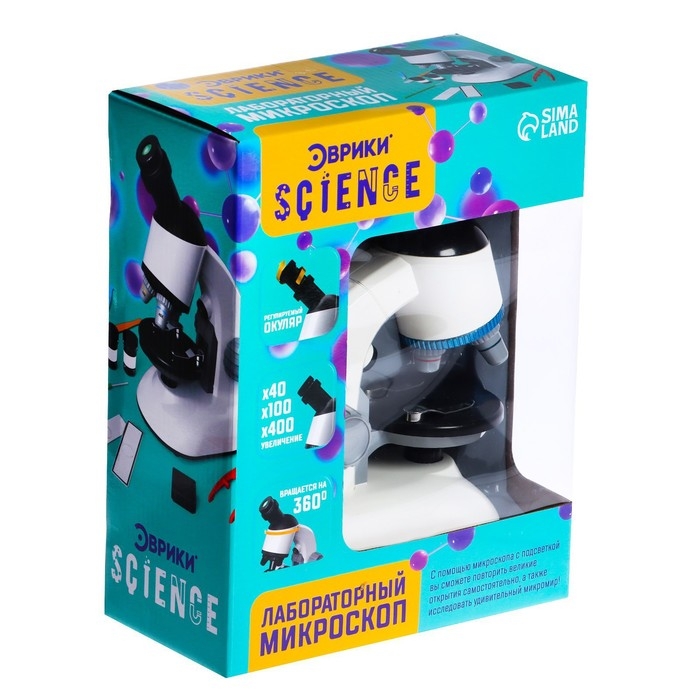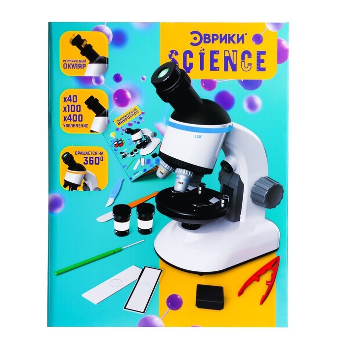 Микроскоп оборудован регулируемым окуляром, который можно вращать на 360 градусов. А подсветка и увеличение в 40, 100 и даже 400 раз помогут в изучении микромира.