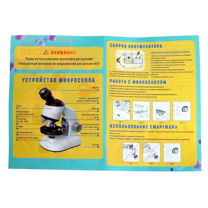 Микроскоп "Юный исследователь", кратность увеличения 1200х, 400х, 100х, с подсветкой