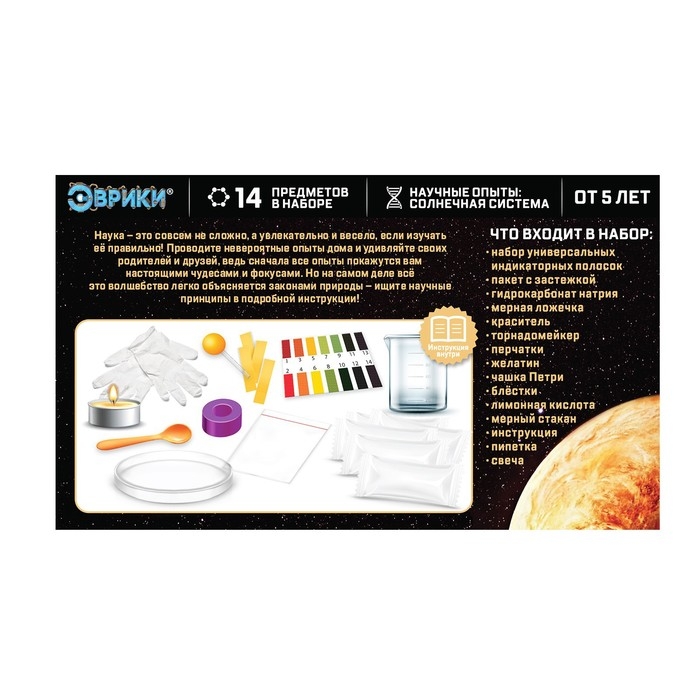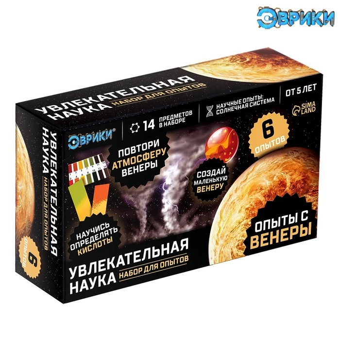 С набором для опытов «Эврики» ребёнок узнает об удивительных свойствах веществ, проведёт несколько интересных экспериментов, связанных с особенностями одной из планет Солнечной системы.