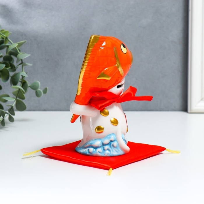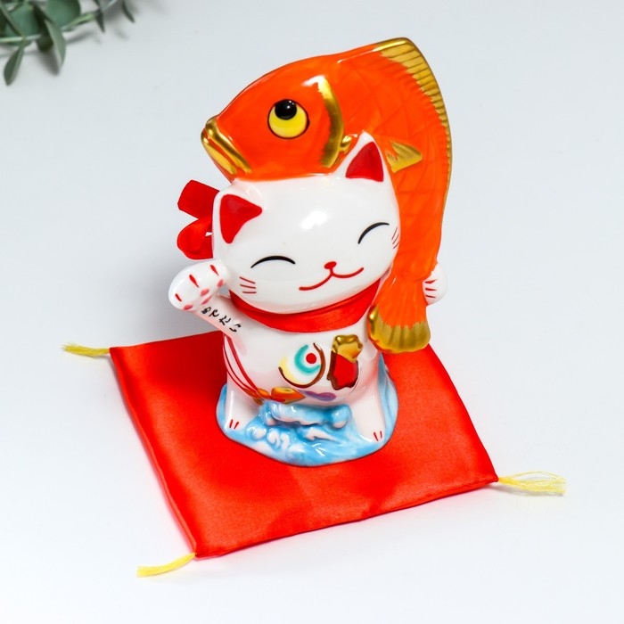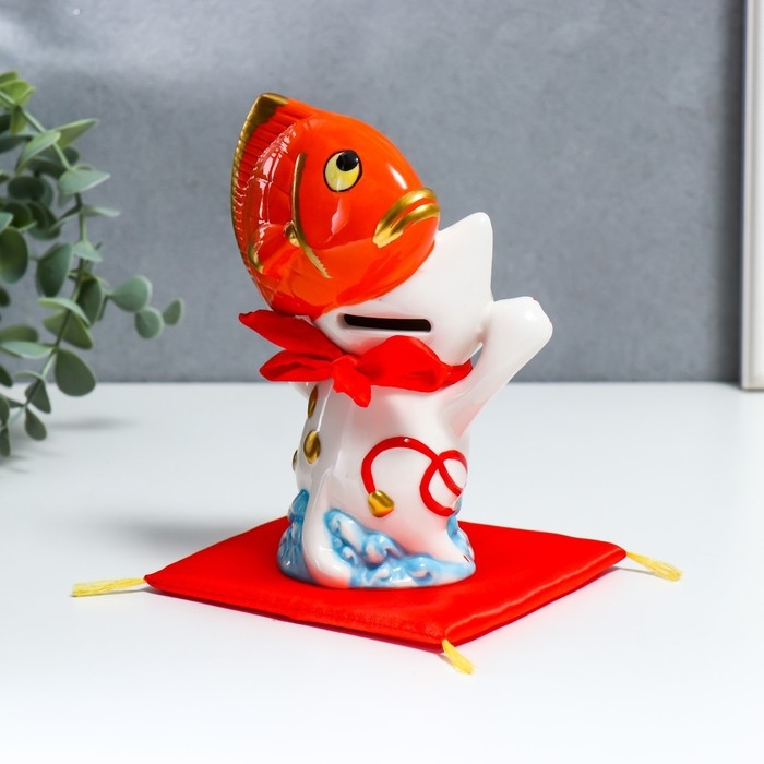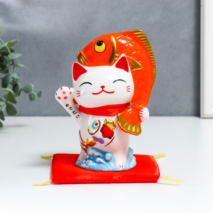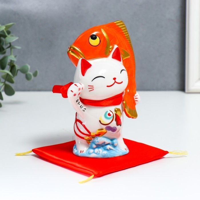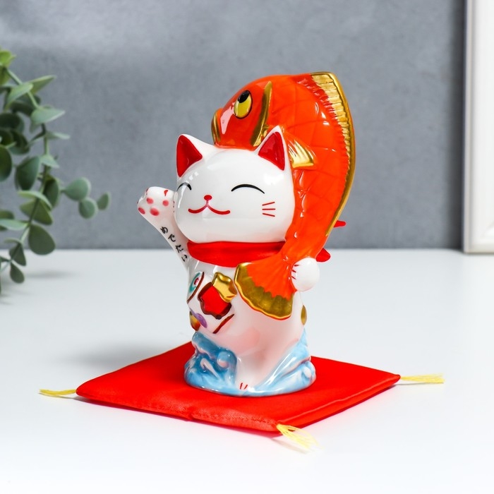 Копилка керамика "Манэки-нэко с крупной рыбкой" 11,5х7,5х16,5 см