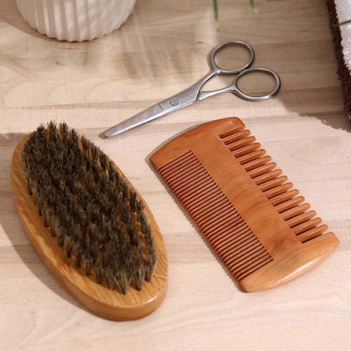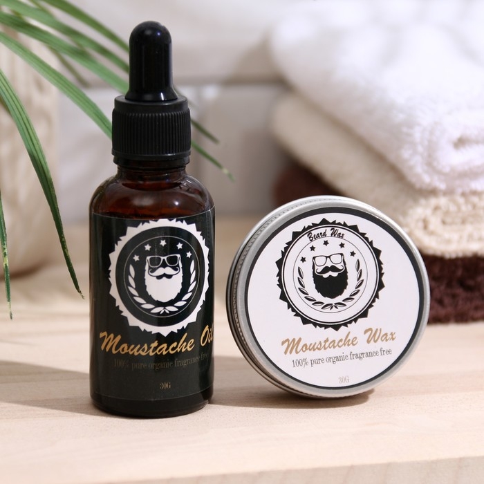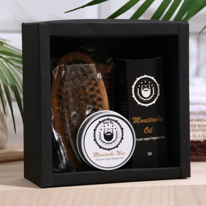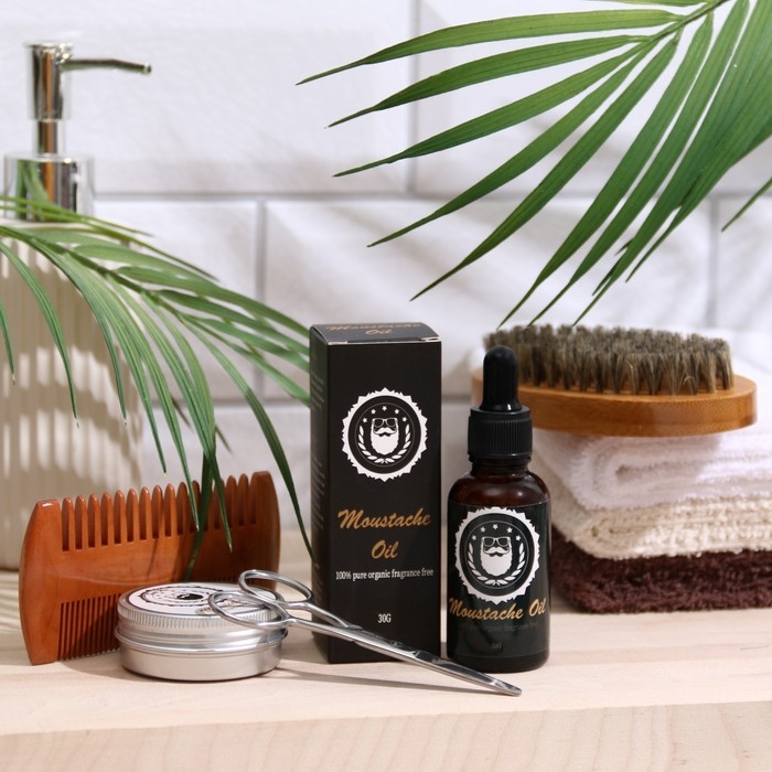 В набор входит: воск для бороды и усов, масло для бороды и усов, расческа, ножницы, щетка.