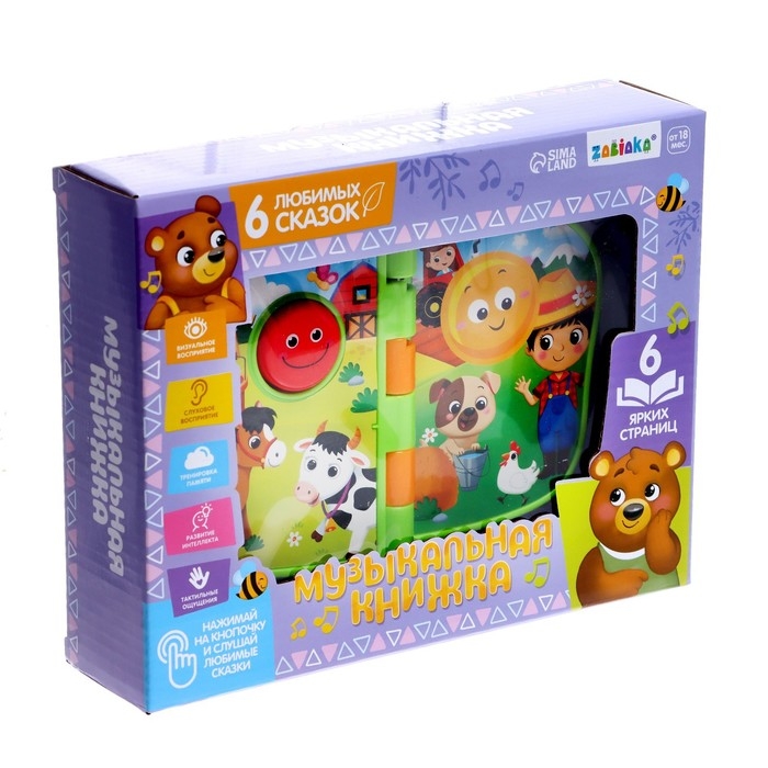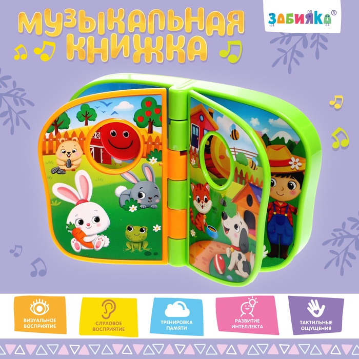 Книжка оснащена музыкальным модулем и проигрывает 5 весёлых мелодий. Они включаются при перелистывании страниц либо от нажатия на кнопку.