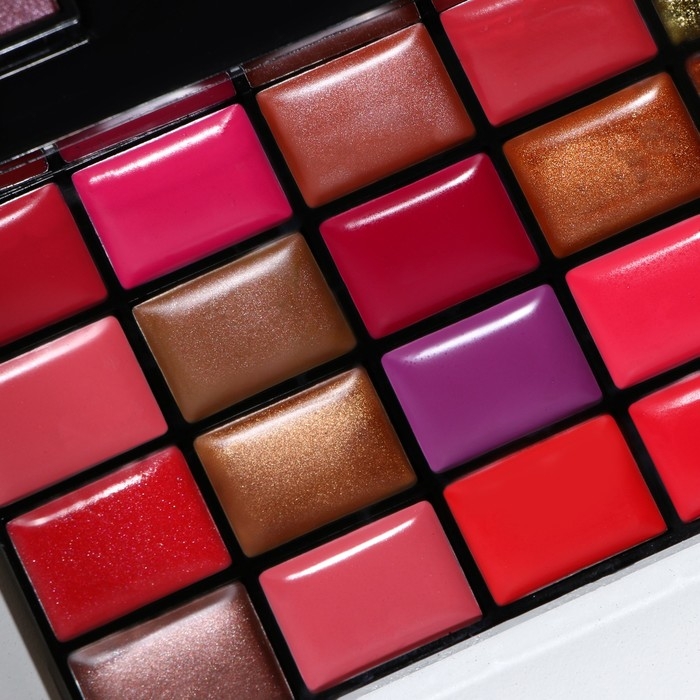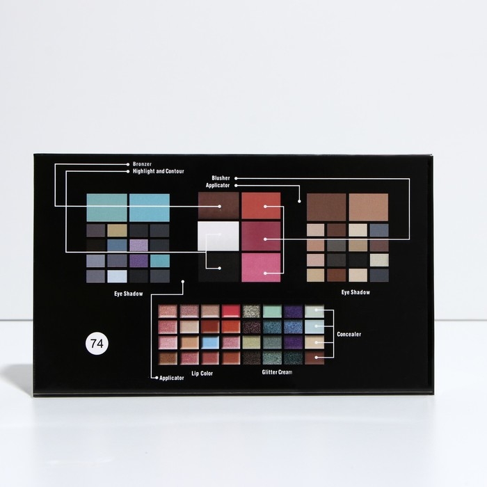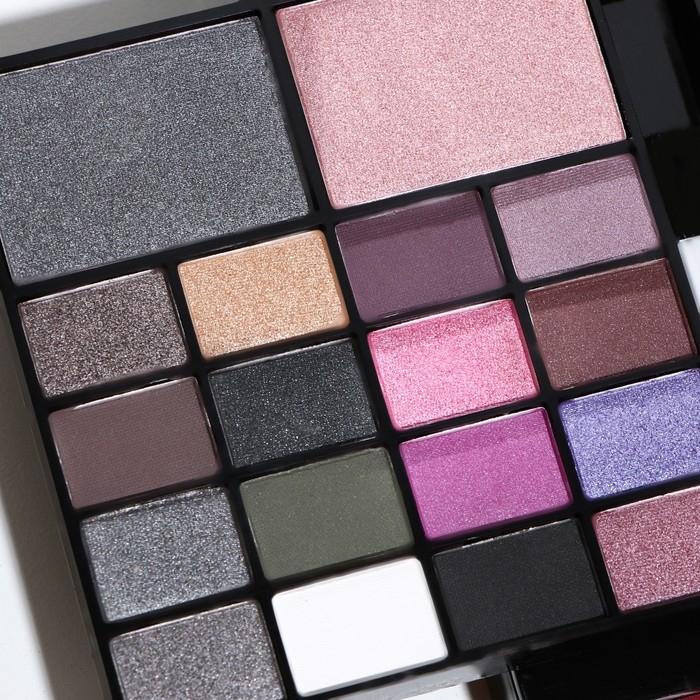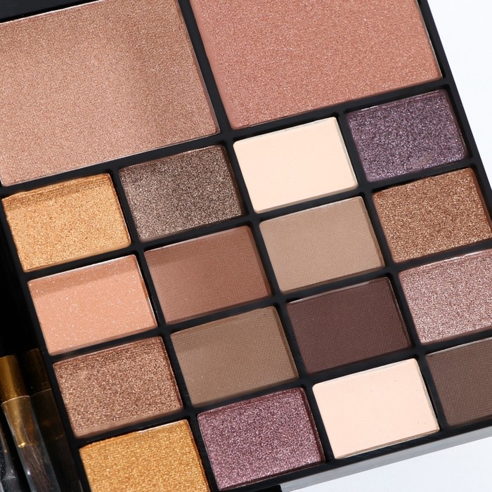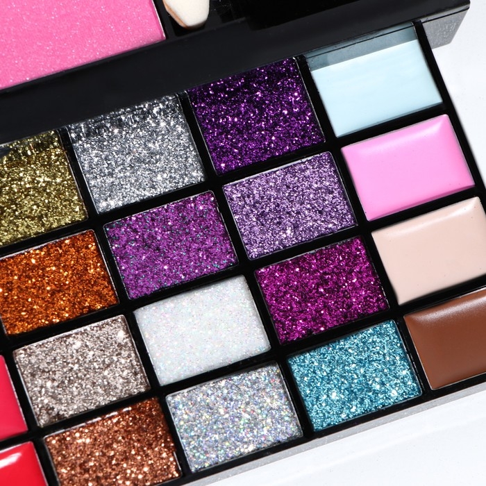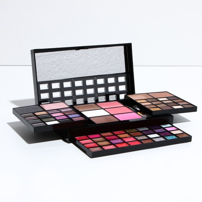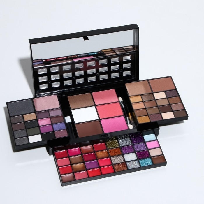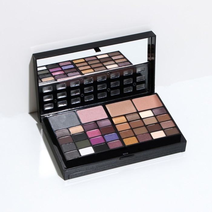 Бьюти-кейс с высококачественной профессиональной косметикой: 32 оттенков теней, 20 блесков для губ, румяна, корректоры, 12 теней с шиммером, большое удобное зеркало, 2 кисточки и аппликатор в комплекте.