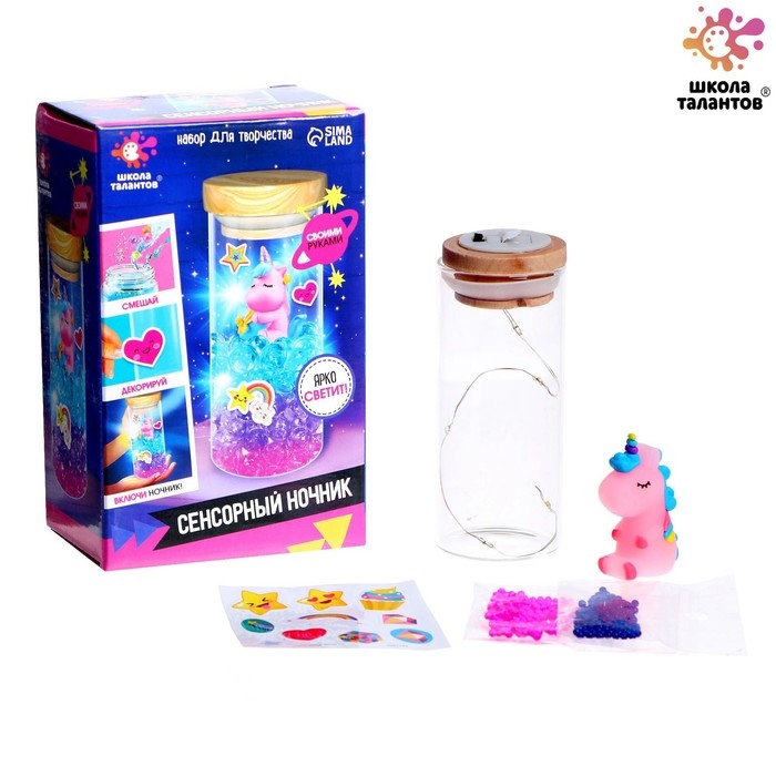 Изготовление такого ночника поможет развить сенсорику малыша. Взаимодействуя с составляющими творческого набора, ребёнок закрепит знания об окружающих предметах и потренирует образное мышление.