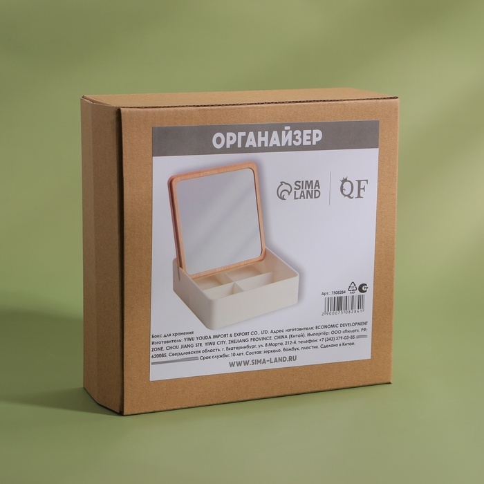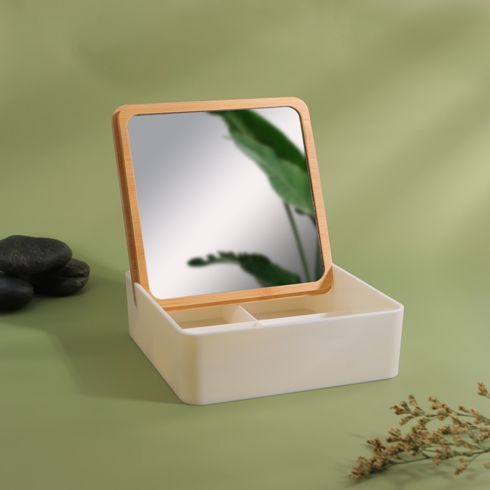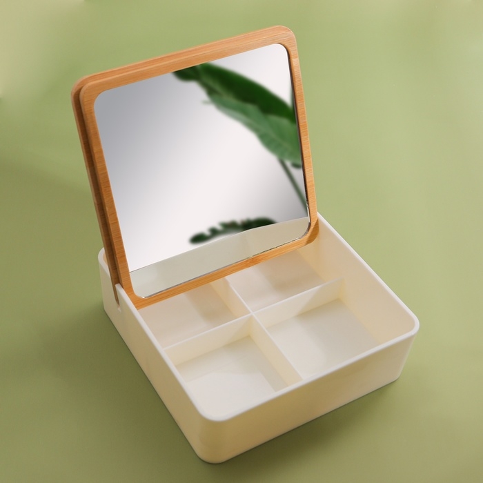 Бокс для хранения косметических принадлежностей, с зеркалом, 4 секции, 15 × 15 × 5 см, цвет белый/коричневый