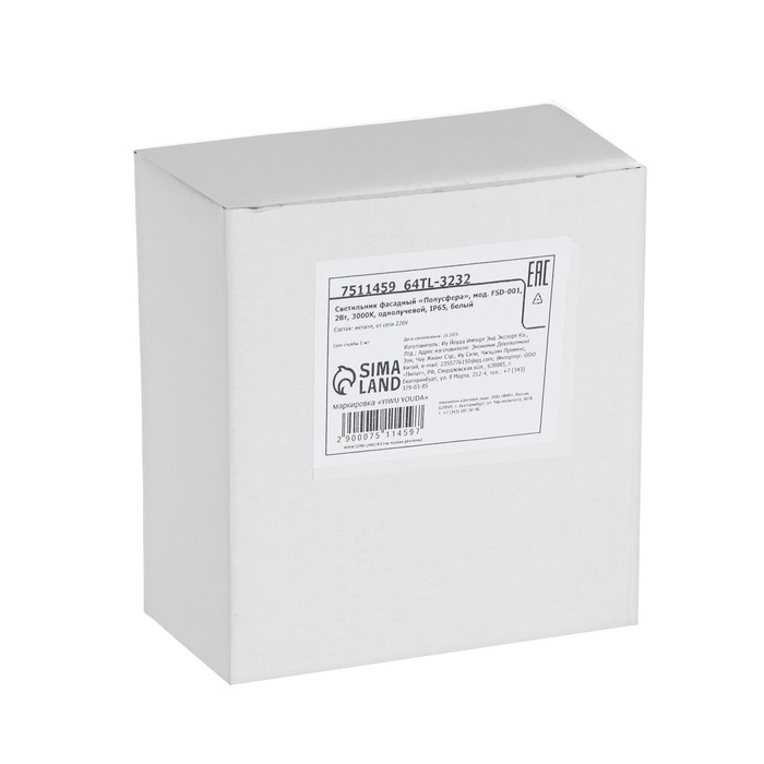 Светильник фасадный «Полусфера», FSD-007, 2 Вт, 3000К, 1 луч, IP65, 220 В, металл, белый