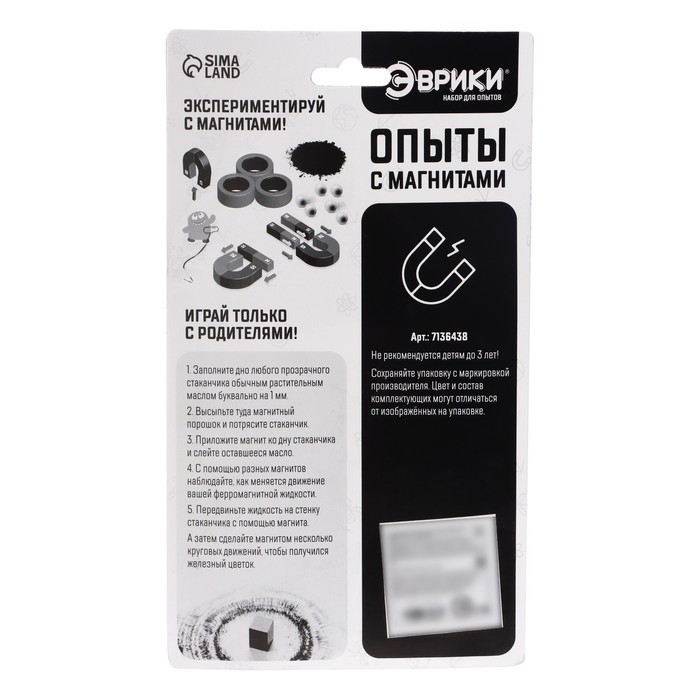 Магниты — удивительные предметы, которые используются повсюду, например, на производстве с их помощью поднимают и перемещают тяжёлые и большие грузы. С набором «Эврики» ребёнок узнает о свойствах магнитов и проведёт опыты с ними.