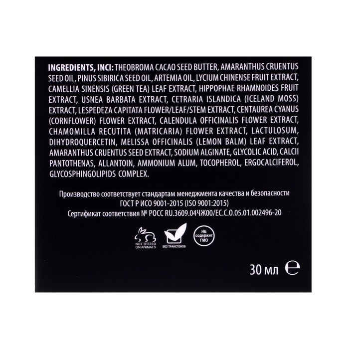 Состав: масло какао, масло амаранта, масло кедровое, масляный экстракт артемии, экстракт плодов годжи, экстракт зеленого чая, экстракт плодов облепихи, экстракт уснеи нитевидной, экстракт ирландского мха, экстракт леспедецы, экстракт василька, экстракт календулы, экстракт ромашки, лактулоза, дигидрокверцетин, экстракт мелиссы, экстракт амаранта, натрия альгинат, гликолевая кислота, кальция пантотенат, аллантоин, каменное масло, токоферола ацетат (витамин Е), эргокальциферол (витамин D2), липидный комплекс.