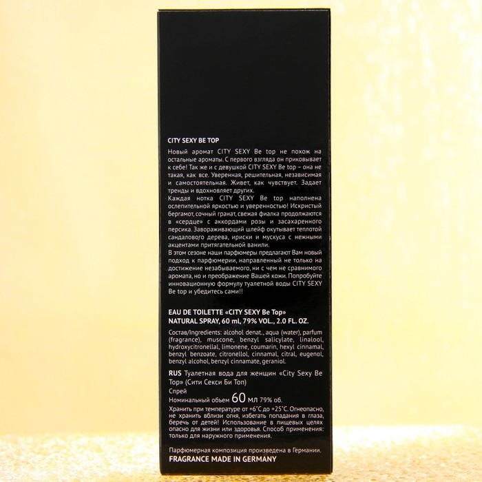 Новый аромат CITY Sexy Be top не похож на остальные ароматы. С первого взгляда он приковывает к себе! Так же и с девушкой CITY Sexy Be top - она не такая, как все. Уверенная, решительная, независимая и самостоятельная. Живет, как чувствует. Задает тренды и вдохновляет других. Каждая нотка CITY Sexy Be top наполнена ослепительной яркостью и уверенностью! Искристый бергамот, сочный гранат, свежая фиалка продолжаются в сердце с аккордами розы и засахаренного персика. Завораживающий шлейф окутывает теплотой сандалового дерева, ириски и мускуса с нежными акцентами притягательной ванили.