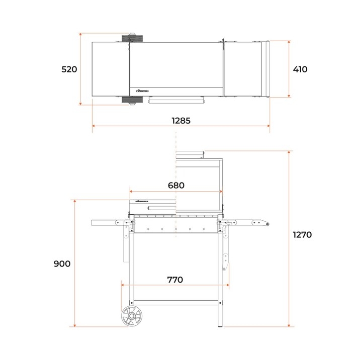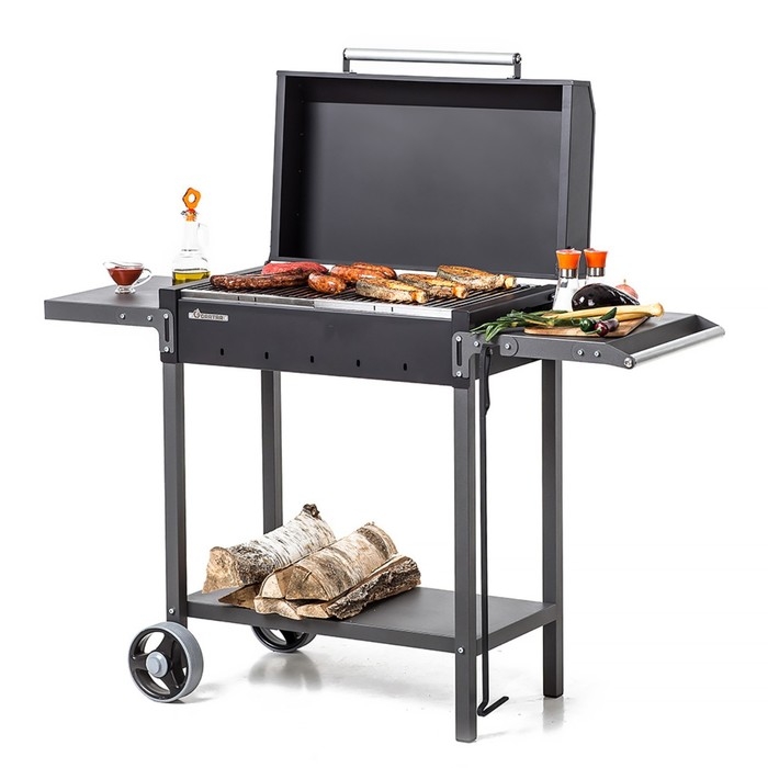 Надёжный гриль-мангал из толстой стали со складными полками.Выдерживает дровяную растопку. Колёса для удобства перемещения. Две полки для размещения продуктов и инструментов. Крышка с термоизолированной ручкой.