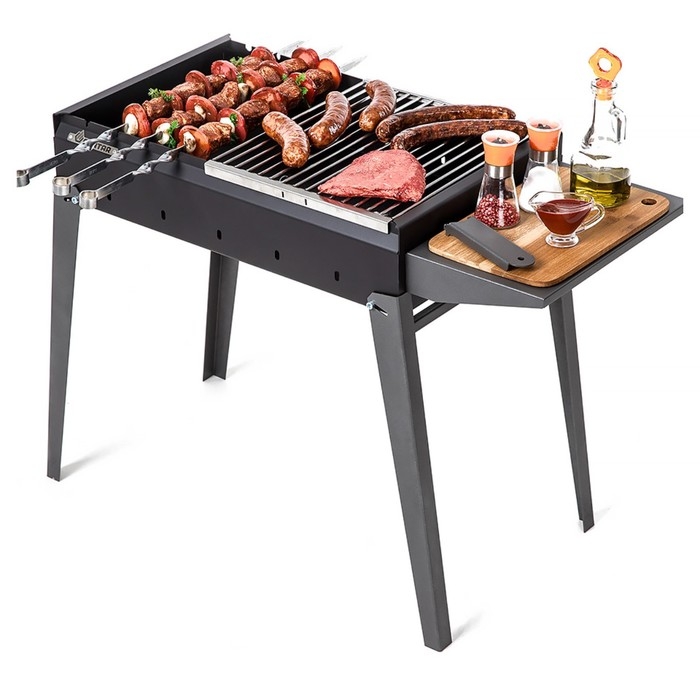 Компактный и надёжный. В сложенном виде удобно хранить и перевозить.Выдерживает дровяную растопку. Складные ножки. Полка для размещения продуктов и инструментов.
