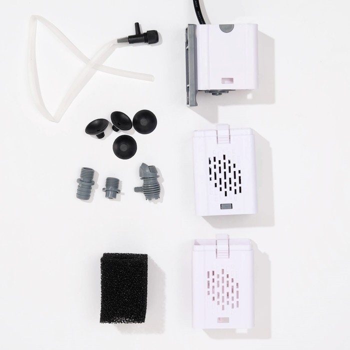 Фильтр имеет две секции, очищение воды происходит с помощью губок, которые пропускают воду через фильтрующий материал, удаляя из нее загрязнения и остатки пищи.
