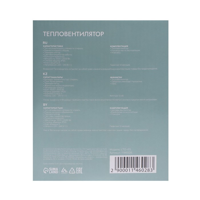 Тепловентилятор Luazon LTO-03, спиральный, напольный, 1000/2000 Вт, 2 режима, белый