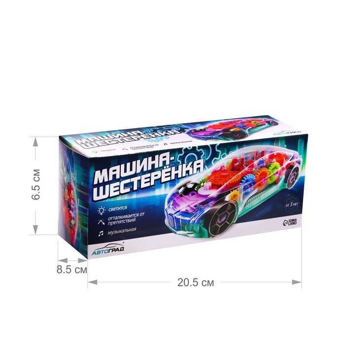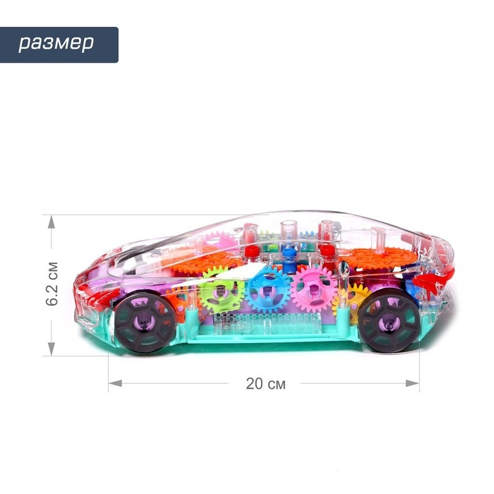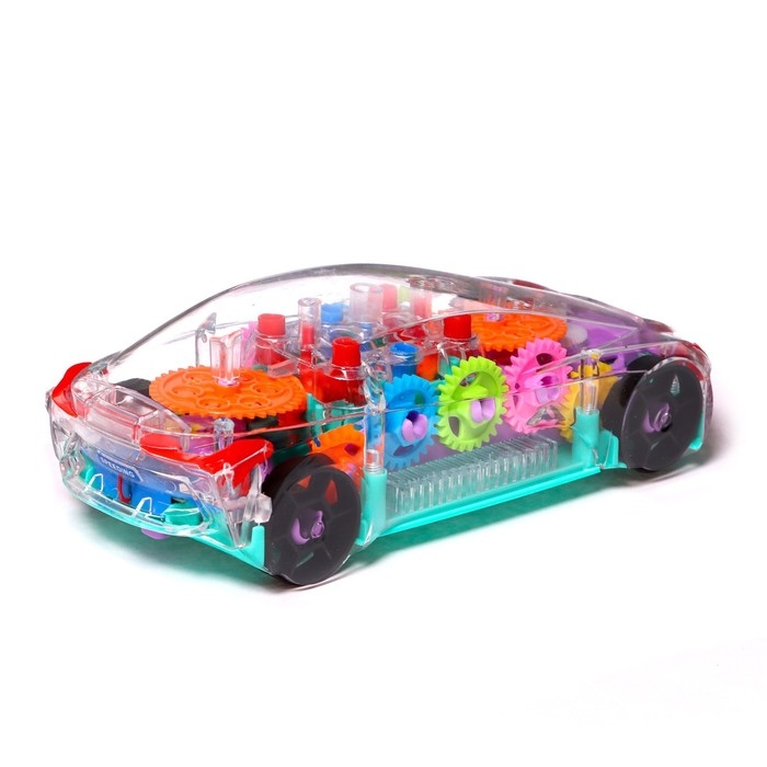 Машина «Шестерёнка» — это транспорт с прозрачным корпусом. У него внутри есть подсветка и движущиеся детали! Машинка объезжает встречающиеся препятствия и воспроизводит весёлую музыку.