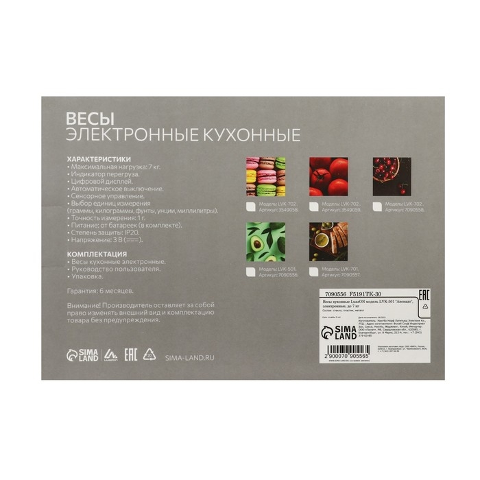 Весы кухонные Luazon LVK-501 "Авокадо", электронные, до 7 кг