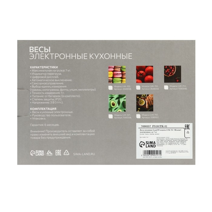 Весы кухонные Luazon LVK-701 "Италия", электронные, до 7 кг