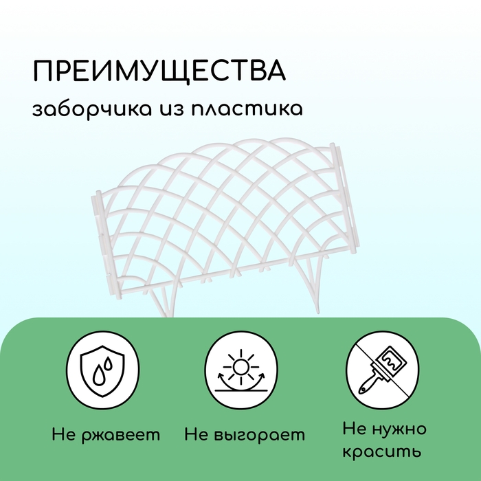 Декоративный заборчик для сада изготовлен из качественного и прочного пластика, который устойчив к воздействиям окружающей среды. Нет необходимости убирать садовый бордюр на зиму. В холодную погоду не подвергайте забор каким-либо воздействиям, так как пластик становится хрупким.