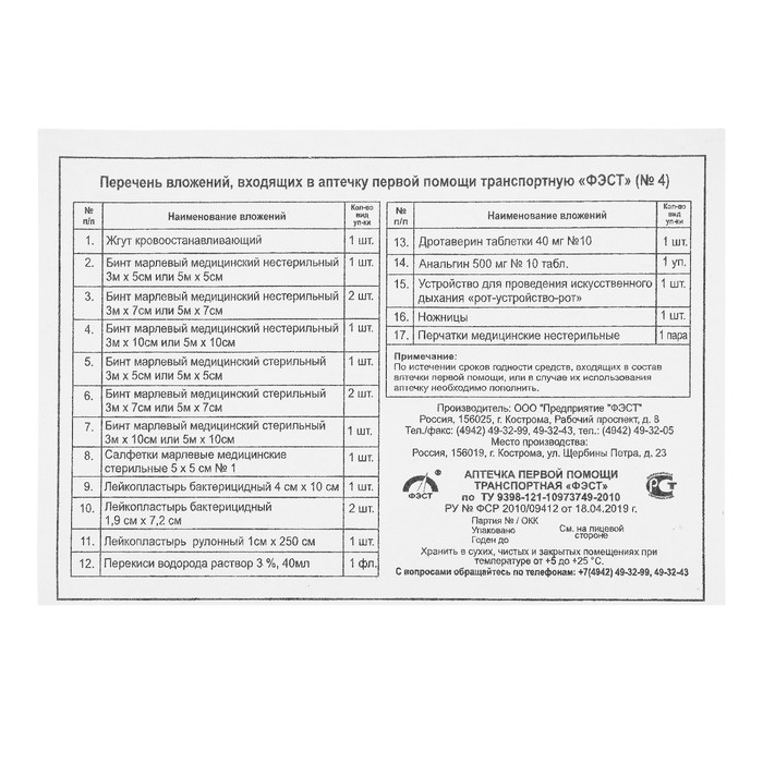 Аптечка первой помощи транспортная "ФЭСТ", перечень №4
